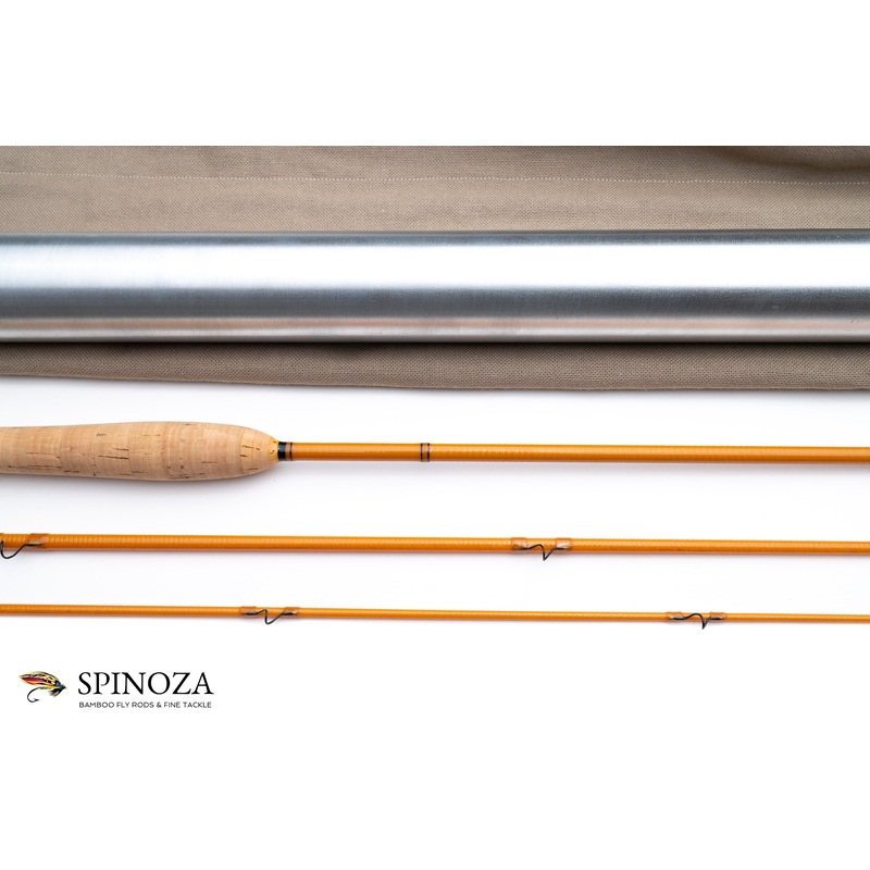 A nice Mario Wojnicki Model 177P3 fiberglass fly rod, 5’10”, 3-piece, 1-tip and built for a #3 line. Medium fast, full flexing action characteristic of this semi parabolic design. The rod appears mint and unfished. Serial #3519. Bright yellow blank with transparent wraps, and black tipping at the grip, signature wrap, female ferrules, and tip top. Spigot ferrules. 5 1/2″ grip done in a Powell style with a composite rear cork check. Dual sliding band rings over a flatted wood spacer with an end cap of cork and composite to keep the rings on. The rod packs into a light tan cloth bag and an aluminum tube with brass fittings with the model etched into the cap.