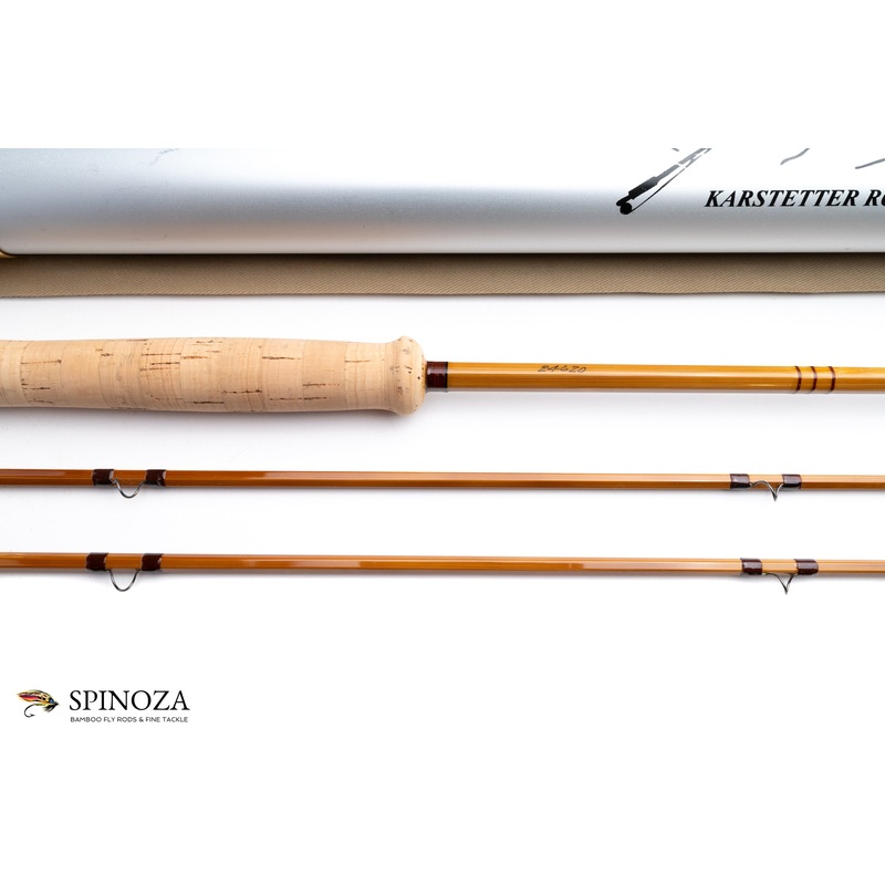 A Marty Karstetter bamboo fly rod, 8’6″, 2-piece, 2-tip, and built for a #5 line. Serial number #24620. The rod weighs 3.7 oz. Hollow built. On the faster side of medium action. The rod appears to be completely mint, not even lawn cast. Two opposed node pattern with very light tan cane color and the tips are mirrored.. Nice varnish coat. The main wraps are brown with black edges at the keeper wrap, agate stripper, ferrules, and tip top. Chrome snake guides. The swiss-style ferrules are oxidized. The grip is 5 3/4″ long and turned to a modified half wells profile. The reel seat is an oxidized nickel silver cap and ring slide band. The cap is engraved “Marty Karstetter, Maker.” The spacer is made of a very attractive walnut burl, unvarnished so presumably stabilized. The rod packs into a light brown cloth bag and original tube with the “Karstetter Rods” stencil.