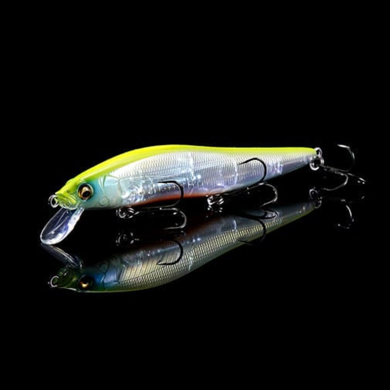 Once the closely guarded secret of the pros, the 110 has quickly become a staple among professional and amateur anglers alike, setting the standard for jerkbait fishing in all U.S. waters. The profile, one-of-a-kind darting action, balancing system and realistic color patterns all contribute to the incredible fish-catching ability of the Vision 110. The tungsten Multi-Way Moving Balancer System (PAT) not only fuels the 110s unparalleled action and huge flashes, but also allows the Vision 110 to cast like a bullet. This deadly package is finished off with three Katsuage out-barb treble hooks, designed to increase hook-setting percentages when power-bait fishing. The Vision 110 excels when the water temps are between 38 to 70 degrees. During this time (especially from November to April in most U.S. waters), the Vision 110 is an excellent choice when fishing points, flats, rocky banks, bluffs, or over underwater grass beds. However, the Vision 110 can also be deadly around boat docks in the heat of the summer. Smallmouth anglers will find no better lure that the Vision 110; in Northern waters, smallmouth bass will attack this lure from spring to fall. The wide range of colors available for the Vision 110 make this bait effective in virtually all water clarity conditions, but our Pro Staff has found the 110 to be most effective in water clarity from one to 20 ft. The Vision 110 is at its best when fished with Megabass Dragon Call line in tests of 6lb. to 15lb. Line size will affect the depth the Vision 110 is able to reach, running about 6 ft. deep on 6lb. test to around 4 ft. on 15lb. test. Try one of the Vision 110’s out on your next trip and find out firsthand the magic of this lure.