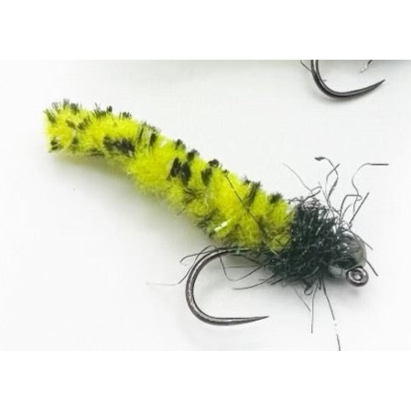The mottled chartreuseMop Fly is an ideal attractor pattern that is remarkably effective in attracting fish. It is especially useful during periods of high water or when inch worms are present.