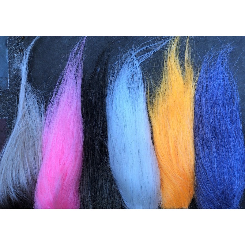 Squimpish Hair is a synthetic fly tying material best described as a synthetic cross of bucktail and polar bear. The fibers come on a patch like a rug and are generally 6″-12″ with “underfur” and “guard hair”. Listed taper is length of working material, variable density on patches. All blend-able and stack-able. Durable and trim-able. Swims extremely well and sheds water when tied sparsely. Blends well with other feathers flash’s and furs.