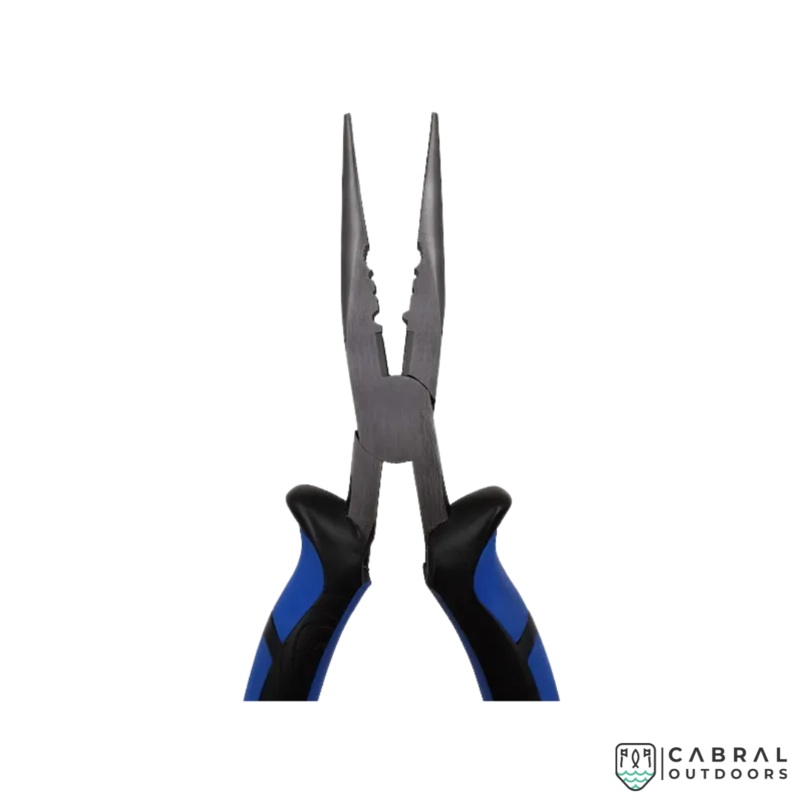 Built with functionality in mind, these pliers feature a line and wire cutter, and a crimper for sleeves and lead. Textured jaws ensure great grip when removing hooks. These pliers are constructed with drop-forged high carbon steel and finished with black PTFE for great saltwater corrosion resistance. Durable double-molded handles add comfort and a secure grip.