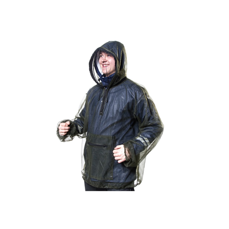 Hel jacka i svart myggnt med dragkedja tvrs ver huvudet. Elastiska muddar runt handleder och midja som hller irriterande mygg och knott p avstnd. ntligen r det mjligt att koncentrera sig 100% p friluftslivet man utvar utan strande insekter!