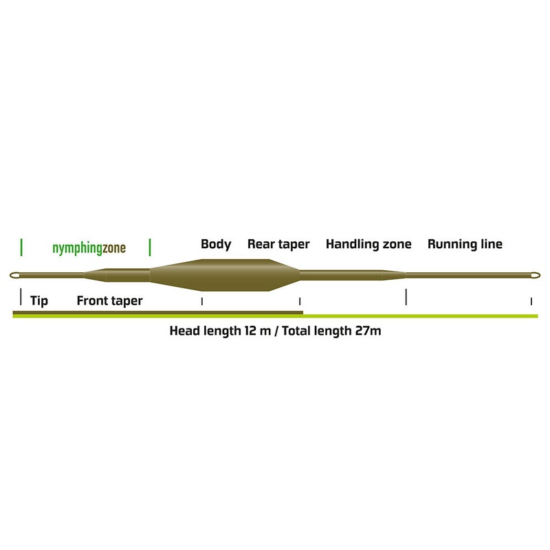 The Nymphmaniac fly line has a unique design that is aimed at technical fishing both with nymphs and dries. It has a super long and thin front taper which enables efficient Euro nymphing even at long distance. Because of the 8 metre light and thin front taper with a 6 metre Nymphing Zone the line wont sag like a traditional fly line when nymphing. This ensures the angler can achieve a perfect drift and maintain good contact for detecting strikes. There is enough weight in the back part of the head so you can cast the line as if it was a traditional WF line. This means that changing to dry fly fishing can be done very quickly. Thanks to the thin and long front taper a soft presentation is guaranteed with dry flies. At the same time it is not an ideal line for big heavily dressed dry flies but it excels in light and technical dry fly fishing with CDC flies for example. The line has extra small loops on both ends for attaching to the backing and leader. Phthalate free.