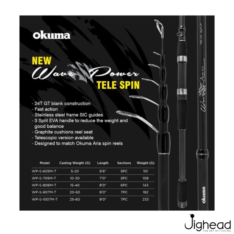 Okuma Wave Power Tele Surf Rod features 24T GT blank construction, saltwater resistant deep press guides, Okuma DPS pipe reel seat, and visual white tip section.