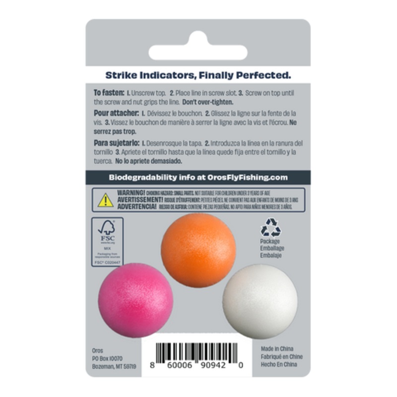 Oros strike indicators feature patented Soft-Lock technology. The design encloses fastening hardware inside of two molded soft foam hemispheres. When closed, the hardware holds the line, while the foam hemispheres compress creating friction between the two hemispheres that keeps them from disengaging. Over-sized threads make securing it to the line effortless.