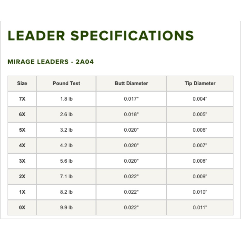 Some fluorocarbon leaders are blended with nylon, lessening the benefits of abrasion resistance and low visibility. Pure fluorocarbon Mirage has the highest abrasion resistance of any leader or tippet. And its refractive index is so close to that of water that Mirage is virtually invisible. With a specific gravity of 1.76, it breaks surface tension quickly and sinks quicker than nylon, perfect for nymphing. Fluorocarbon materials retain their knot and tensile strength in water. Preferred for nymphing, especially in gin-clear waters or where fish are educated. Great for large streamers too. Outstanding turnover power, the result of patented extrusion taper technologyan Orvis exclusive. Fly fishing leader preferred in spring creeks, stillwater situations, for use with large streamers, or when fishing with nymphs in clear water where trout are fished over heavily.