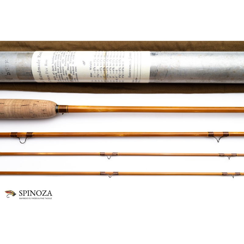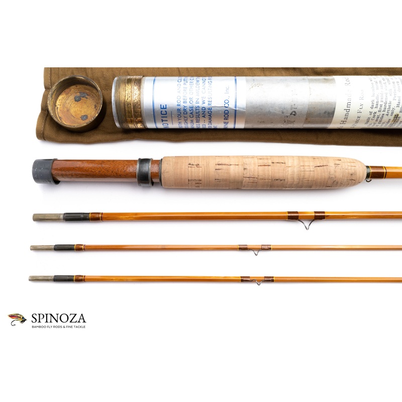 An EF Payne model 202 bamboo fly rod, 8′, 3-piece, 2-tip, and built for a #3 or #4 line. The rod weighs 4.1 ounces on my scale. This is an older Payne that has been refinished, with the older die stamp on the butt cap, agate stripper, and very fine tips with agate tip tops. Medium-slow full flexing action. Light flamed cane with brown main wraps with yellow edges on all, fore and aft at the keeper, male ferrules, and tip tops. It has additional wraps of wraps of purple at the keeper and male ferrules. The step ferrules are oxidized and are the early pot belly type. The stripper agate and the snakes are the high slant style. The keeper is one flat right. The freshly redone varnish is very good. The grip is 5 1/2″ long and turned to a blunt cigar profile. To my eye the front cork check, grip, and reel seat wood appear to have been replaced. The front cork check does not have the dished look. The flatted reel seat looks to have had a reel foot on it only once, not consistent with the age of this rod (95100 yrs old). The butt cap has the early stamp E.F. Payne, rod, E.F. Payne Rod Co., Makers.. The rod has a slight downward set. The rod bag is missing the hang tag.