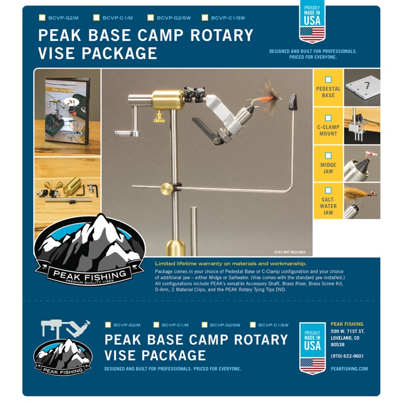 The Peak Base Camp Package is perfect for the tier looking for the very best and most versatile vise and accessories. It comes in your choice of additional jaw, either Midge or Saltwater option. The vise comes with the standard jaw installed.