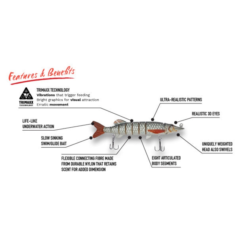 This incredibly realistic lure, with 8 articulating sections, features a weighted swivel head and produces an incredibly life like action underwater. Whether you are casting or trolling, this swimbait will blow your mind with its amazing underwater action. It drives all predatory fish wild, including Pike, Musky, Bass, Trout, Lakers & Walleye!
