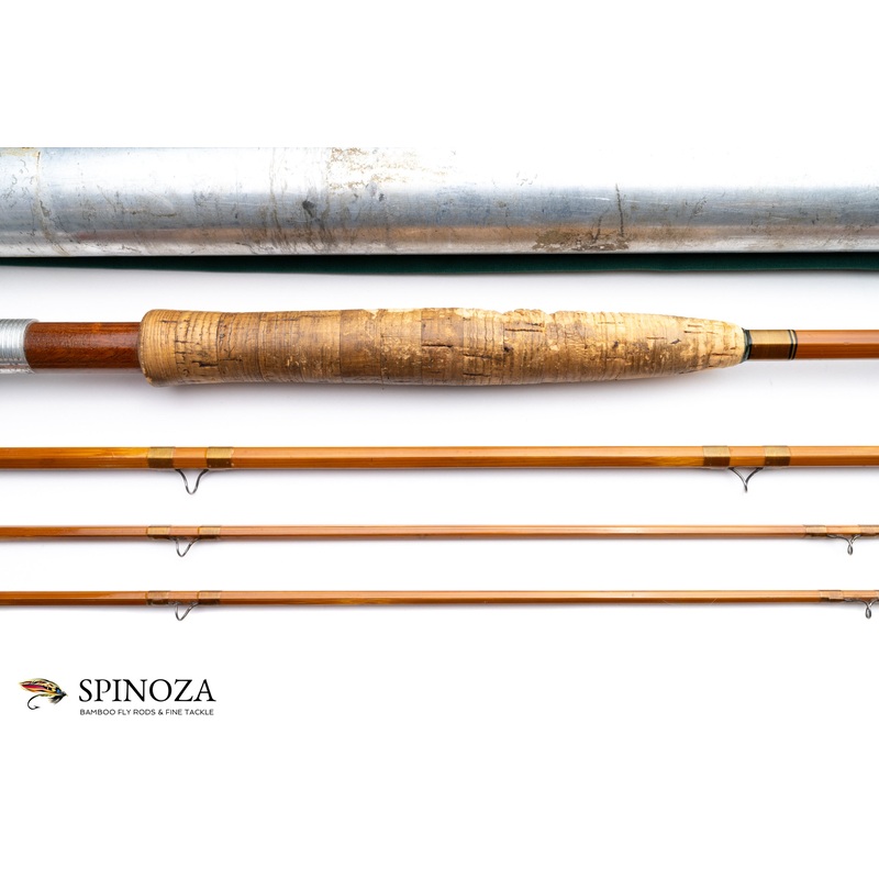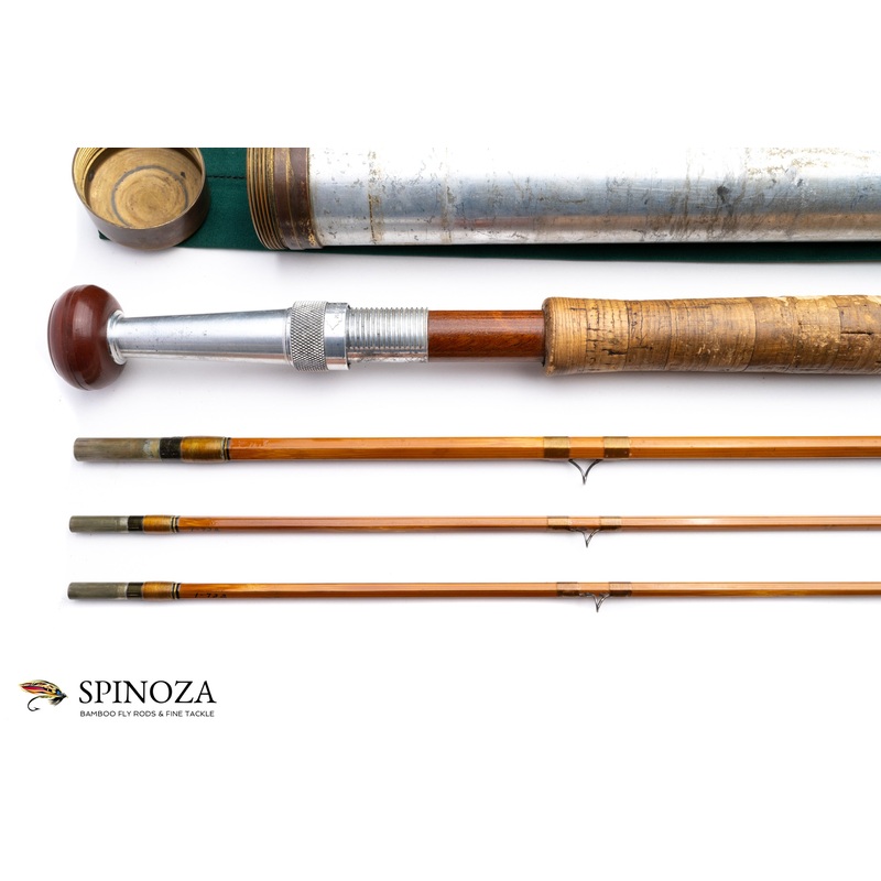 A HS “Pinky” Gillum bamboo salmon rod, 9’1″, 3-piece, 2-tip, and built for what feels like a #8. Serial # 1-732. Fast DF action. Fair condition, with a small clear wrap below the bottom guide on one tip. The grip has some erosion, I suspect from storing the fly hook. There are some cracks to the ferrule wraps and the varnish overall is firm but has lots of scratches and scuffing. The snake guides have some noticeable flatting to the inner guides. Lastly, I also think the rod may have been purposefully cut down at one point, based on a somewhat unusual guide arrangement near the butt ferrule and because of some correspondence between the original owner and Pinky which references a cut down at the request of the owner (which I have seen but is not provided with the sale). The fixed fighting butt appears to have been added to replace the lost length.Light flame and oven tempered cane, with slightly lighter nodes done in a 2-opposed pattern. Light brown main wraps with black/yellow/black edges at the keeper and male ferrules. Perfection stripper. Black high arch H.S.S. snakes. Oxidized Super Z females and the fits are good. The grip is 7 1/2″ long and shaped to a western profile with a hidden pocket cap. The uplocking aluminum screw lock is stamped “H.S. Gillum, Maker”, and the varnished spacer is mahogany with a bit of tiger striping. The added-on fixed fighting butt is 3″ long with a large rubber button. The rod packs into a green bag with a pull tie, and the aluminum tube has a brass colored bottom and top, but no data stickers.
