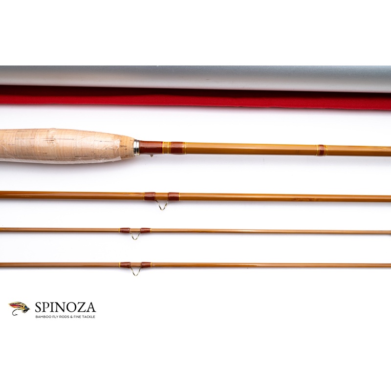 A very nice Robert Bolt bamboo fly rod, 8′, 3-piece, 2-tip, and built for a #5 line. Serial #1510. The rod weighs 3.9 ounces on my scale. Action is slightly faster than medium, and this is one of my favorite Bolt tapers. The rod is mint and appears uncast. Medium chestnut oven tempered cane done in a two-opposed node pattern. Superb varnish work, no flaws. The main wrap color is a medium brown with yellow edges. Robert makes his own ferrules, plugs, and screw lock seats. The ferrules are overwrapped like Winston and Howells rods. Carbide stripper and chrome snake guides. Brass and cork ferrule plugs. The grip is 6″ long and shaped to a sculpted western profile with a hidden pocket cap. The spacer is a handsome piece of varnished zebrawood. The aluminum uplocking screw lock is stamped “R.K. Bolt, Maker”, and “R.K. Bolt” is stamped on the ferrule welts as well. The rod packs into a red cloth bag and a frost coated aluminum tube.