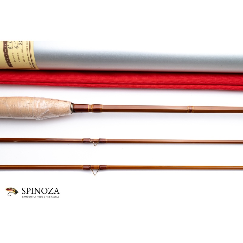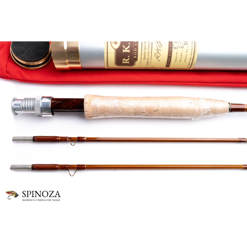 An RK Bolt bamboo fly rod, 8’6″, 2-piece, 2-tip and built for a #5 line. Serial #8601. The rod weighs 4 ounces. Mint, unfished condition with the plastic still on the grip. This rod was made from Howells blanks, which Robert offers from a very limited supply. Medium fast action. The rod sections are stained a chestnut color and done in a two-opposed node pattern. Brown main wraps with yellow edges and a band of red at the keeper. Carbide stripper and chrome snake guides. The ferrules are fully overwrapped and the female welt has a tiny R.K. Bolt stamp. The female sports a knurled brass and cork ferrule plug. Excellent varnish. The cork grip is 6″ long and turned to a western profile with a hidden pocket cap for the uplock screwlock seat. The screwlock is made by Robert and is stamped R.K. Bolt, Maker with a nicely radiused end cap. The rod shaft is semi-hollow built and the screwlock barrel has a roller die stamp depicting a hollow-built rod section. The rod packs into a red cloth bag and an aluminum tube with the Robert’s data sticker affixed to it.