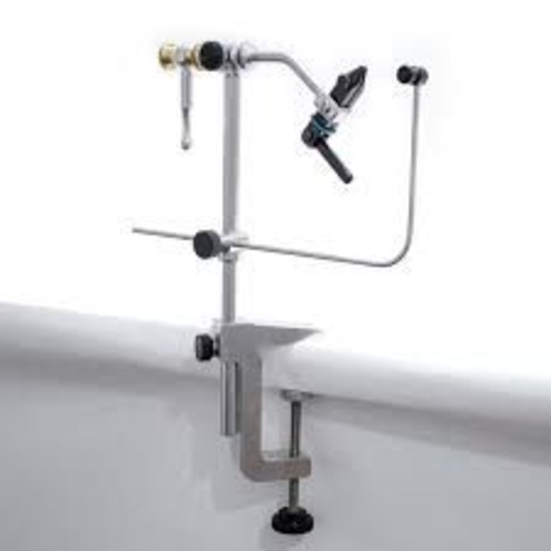 Standard features for the Traveler Series Vises are an adjustable bobbin cradle, case harden cam jaws, rotary tension screw, a black powder coated base with a 7″ stem, or a *black powder coated c-clamp with an 8″ stem.