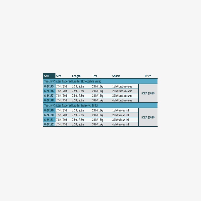 Each option is available with 15 lb, 20 lb, 30 lb and 45 lb wire strength bite tippet. The 15 lb and 20 lb wire leaders are attached to a 20 lb class tapered leader, while the 30 lb and 45 lb wire bite tippet options are attached to a 30 lb class tapered leader.