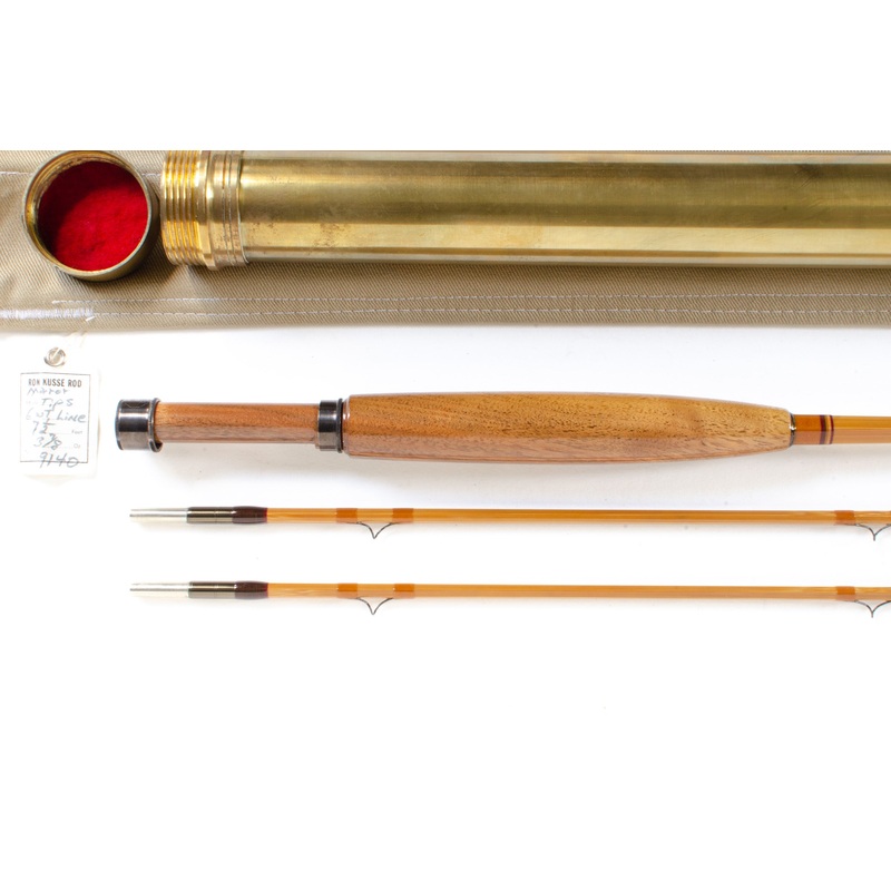 A nice Ron Kusse fly rod 7’6″, 2-piece, 2-tips, built for a #6 line. Serial #9140. “Mirror tips” model. The hangtag states the weight as 3 7/8 oz however my scale says 4.8 oz. Mint condition, unused, in an all-brass tube. The rod has a fast DF action. It was intended as a showpiece as it has an all-walnut grip and reel seat. The walnut grip is neatly sculpted to a slim cigar and matches the wheat straw cane temper color nicely. The bamboo shafts have an excellent coat of varnish. Node pattern is 3 up construction. Tips are mirrored. The temper color is wheat straw. The main wraps are tan with a maroon edge at the keeper, male ferrules, and tip-top. There are 4 extra wraps at the keeper, purple, brown, tan, and maroon. The ferrules are Leonard step style and are oxidized black. The reel seat is an oxidized cap and ring. The cap is stamped “Ron Kusse, Maker “in a cartouche opposite the wrap flat. The rod comes with a cloth bag with Ron’s hangtag. All is packed in a stunning all-brass tube.