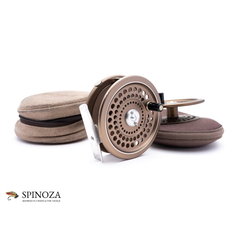 A very nice Sage 505L fly reel with a spare, set up for RHW. This reel was made exclusively for Sage by Hardy Brothers of England. This is the Sage equivalent of the Hardy St. John or JLH and Sage had them add a palming rim. Good used condition with some loss of finish on the frame edge in a few spots and some mounting marks on the foot, but the wear is cosmetic. No major defects and the reel functions perfectly. The spare spool shows very light traces of use. Reversible single screw nickel silver line guide. Strong smooth drag with a loud outgoing click. Designed to hold lines from 5-7. The reel comes in the original leather zip pouch with the Sage logo, and the spare spool comes in a Sage neoprene pouch.