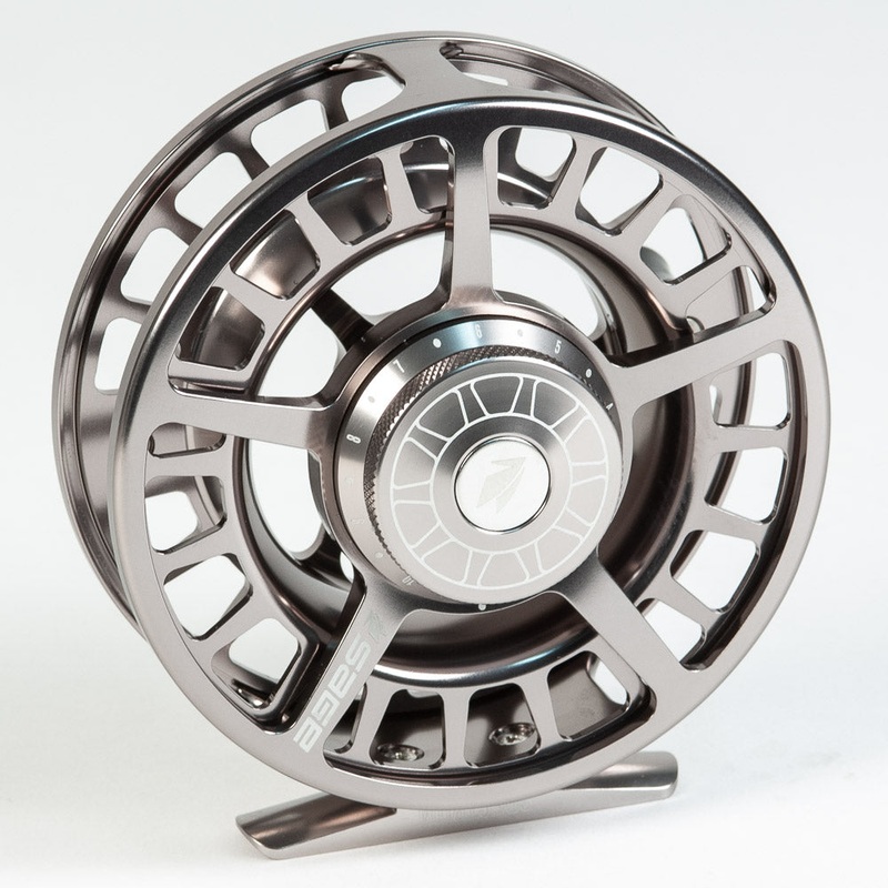 The Sage Spectrum is a mid-priced machined aluminum reel with a solid drag suitable for both fresh and saltwater species. The spool is quickly removed by pressing it away from the frame. The Spectrum LT is a lighter weight reel with a spool release knob to lock the spool in place.