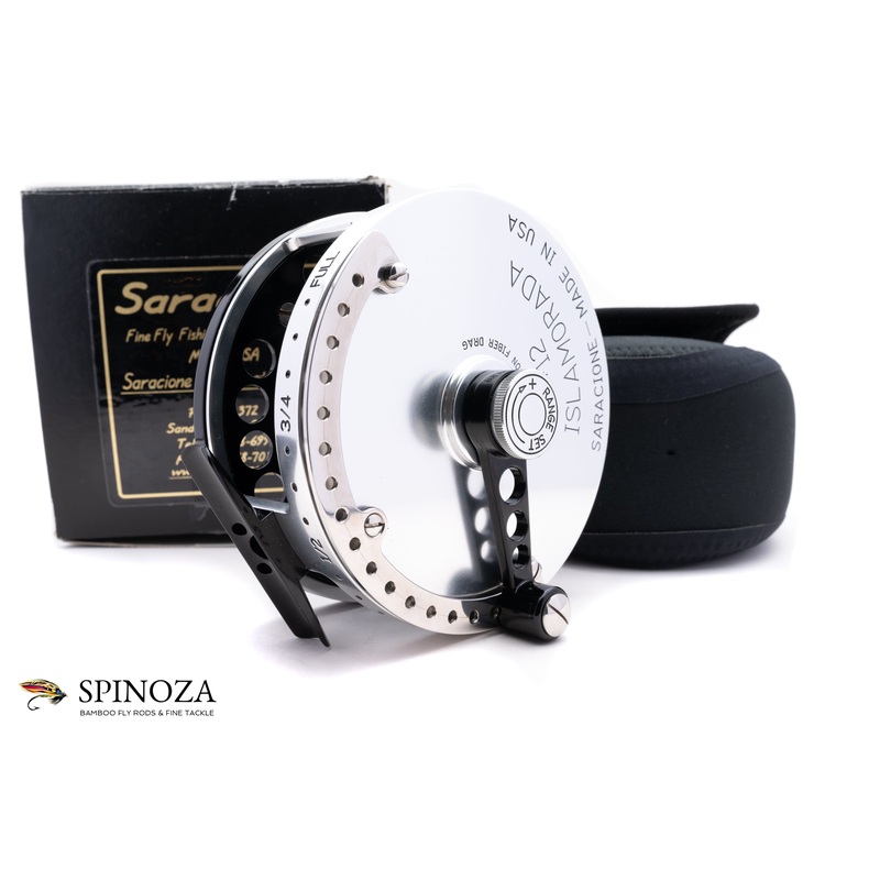An excellent Saracione Islamorada #12 reel, 4 1/2″ diameter and set up for RHW. Silver anodized frame with a black anodized spool. Serial #123. I can find now sign of the reel having been fished. This is part of a large arbor series of saltwater reels that Joe created recently designed to battle the toughest bonefish, tarpon, or permit. This #12 model weighs 14 ounces, and has capacity for a #12 line with 300 yards of backing. It is heavily ventilated to keep it lightweight and for ease of flushing salt off. The reel has a multi-disk carbon fibre drag that feels like it could stop a tug boat when set on full, and it is adjusted via a range knob combined with a lever. As usual the fits and finishes of Joe’s reels are stunning. Comes packed in a padded neoprene pouch and original box with paperwork. This is a fantastic option for the saltwater angler or anyone who appreciates classic saltwater reels, and they are pretty tough to find.