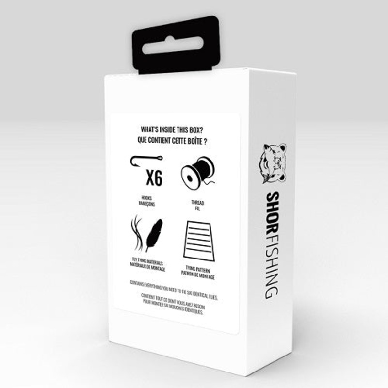 Each package contains a tying pattern and all the materials required to tie six identical flies.
