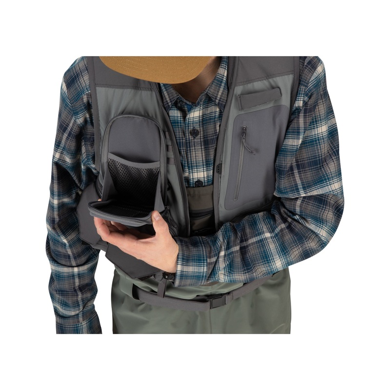 Updated pocket array includes compression molded fly box storage pocket and stretch woven secure phone pocket on upper chest