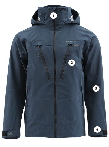 (1) Fully adjustable drop hood prevents hood from bunching around the back of the neck when fully zipped. Hidden Cohaesive hood adjusters are located in exterior chest pockets to prevent line snagging.