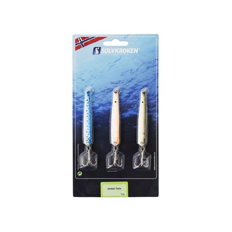 Tre klassiska allrounddrag fr fiske efter havsring, sej, torsk och lubb! Jensen Tobis-draget imiterar tobisrrelser i vattnet. Draget r ltt att kasta lngt, och det kan vevas in bde snabbt och lngsamt. Alla tre dragen i detta set vger 12 g.