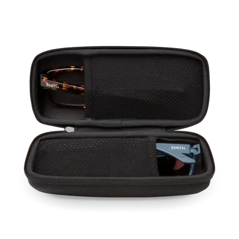 Zippered sunglass/eyeglass case with interior liner. Safely accommodates two sunglass/eyeglass frames with 4-6 base lens curvature. Travel case will not fit shield sunglass models or lenses with an 8 base curvature.
