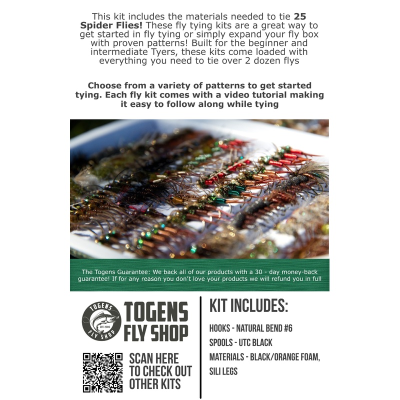This kit includes the materials needed to tie 25 of the Spider a versatile topwater pattern thats perfect for targeting aggressive surface feeders. These fly tying kits are a great way to get started in fly tying or expand your arsenal with proven fish-catching patterns. Designed for beginner and intermediate tyers, each kit comes with everything you need to tie a dozen flies of each pattern.
