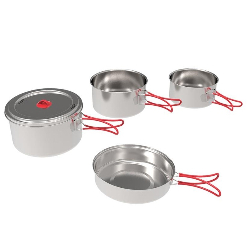 This cook set is made from stainless steel including the swing-out handles which feature silicone covers to keep them cool to the touch. The set includes 3 pots and a frying pan as well as a unique lid that fits all 4 pieces, has drain holes incorporated into it, and has a stay-cool silicone knob. It all nests together and comes with a mesh bag for convenient storage.