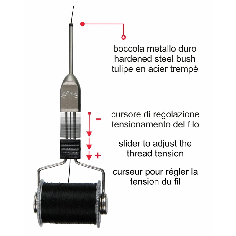 Stainless steel bobbin with slider to adjust the thread tension. Allows a quick change of the spool. Perfectly balanced when rotating, is ideal to create a split thread dubbing loop. Tube with very strong hardened steel bush to prevent fraying.