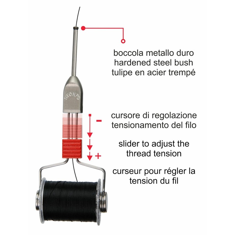 Stainless steel bobbin with larger tube ideal for voluminous threads. Allows a quick change of the spool. Equipped with slider to adjust the thread tension. Perfectly balanced when rotating, is perfect to create a split thread dubbing loop. Tube with very strong hardened steel bush to prevent fraying.