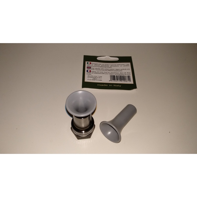 Hair stacker with rubber bottom. Aligns perfectly any type of hair. Supplied with two different sized cones.