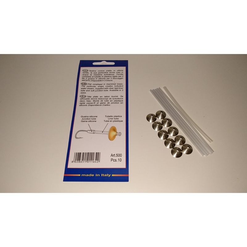 Flat conehead in machined brass. The particular shape creates turbulent water stream. Supplied with clear rigid liner tube and soft junction tube. Available in size 12mm. 1 bag contains 10 coneheads.