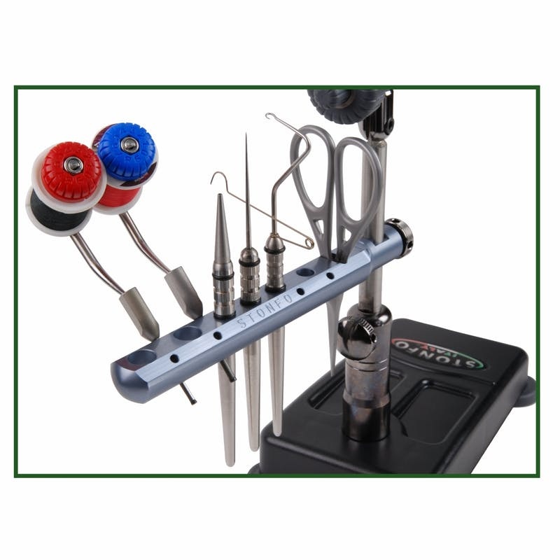 Practical and functional tool holder supplied with adaptor bush to fit on vise stems from 8 to 10 mm (3/8). Made of anodized aluminum has a series of 15 holes of different shape, size and angle, that allow the positioning of the majority of existing tools.