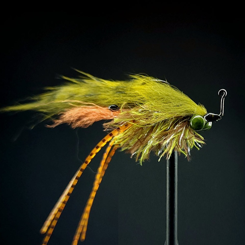 The Straggle Shrimp is tied with brass dumbbells on a Firehole 511 Barbless 90 Degree Jig Hook, for a steady sink rate, with the hook point riding up.