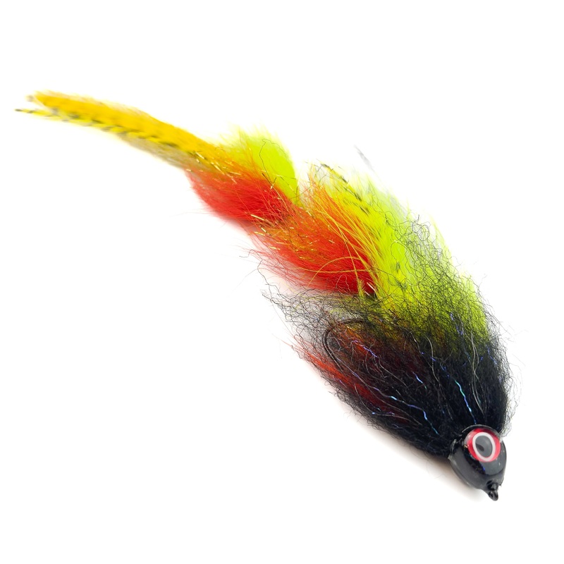 The predator size Masked Avenger pattern; 3 sections, one predator hook or stouter hook depending on the target species. These fun flies have accounted for many species including pike, muskie, striped bass, bluefish, tigerfish and dorado