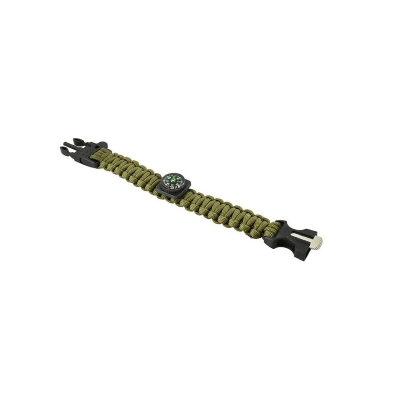 Paracord-tau er sterkt og kan brukes til mange praktiske forml. Med kompass til orientering, flintstl som fungerer selv om det er vtt og SOS-flyte med langtbrende lyd ker du kjangsene dine for overlevelse om du skulle g deg vill.