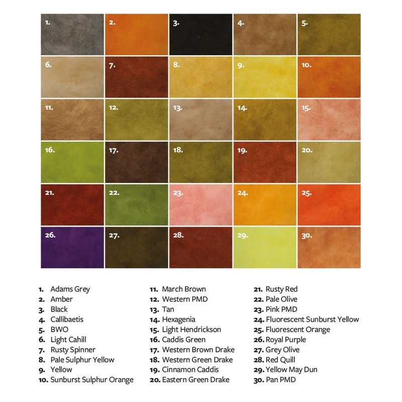 TACTICAL DRY FLY DUB|ADAMS GREY|BLACK|CALLIBAETIS|LIGHT CAHILL|BWO|YELLOW|PALE SULPHUR YELLOW|RUSTY SPINNER|SUNBURST SULPHUR ORANGE|MARCH BROWN|TAN|WESTERN PMD|HEXAGENIA|CADDIS GREEN|LIGHT HENDRICKSON|CINNAMON CADDIS|WESTERN GREEN DRAKE|WESTERN BROWN DRAK