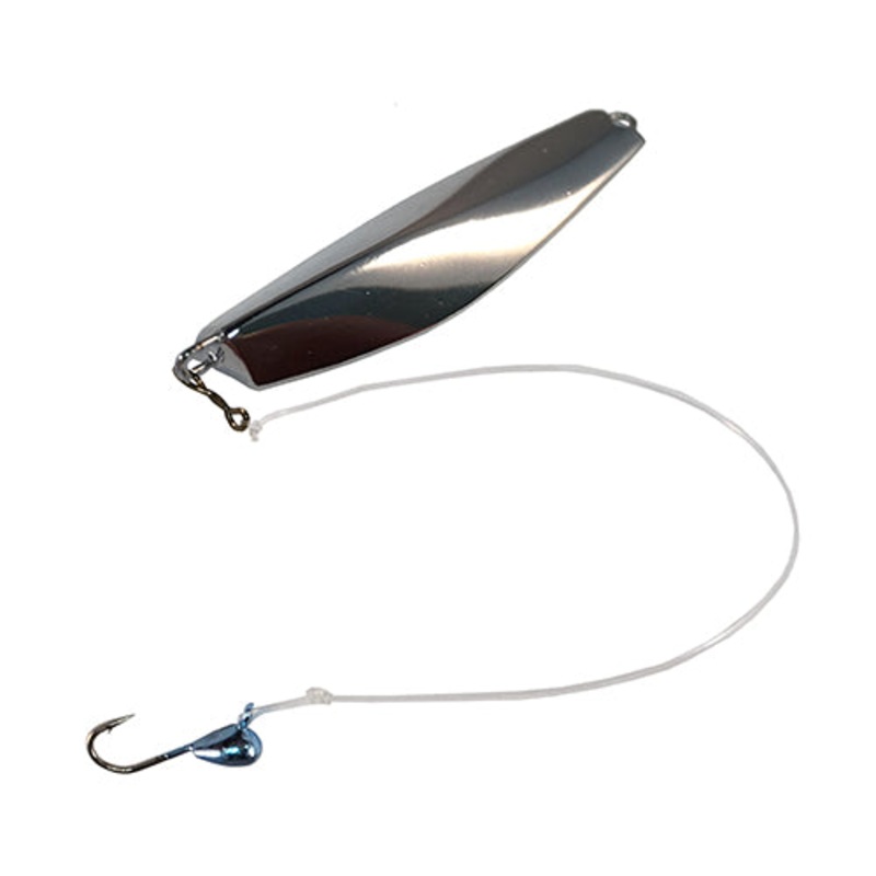 Bunden med 0,20 mm Fluorocarbon-lina 8-10 cm knuten med gelknut (bttre rrlighet) i mormyskan samt snapper i andra ndan.