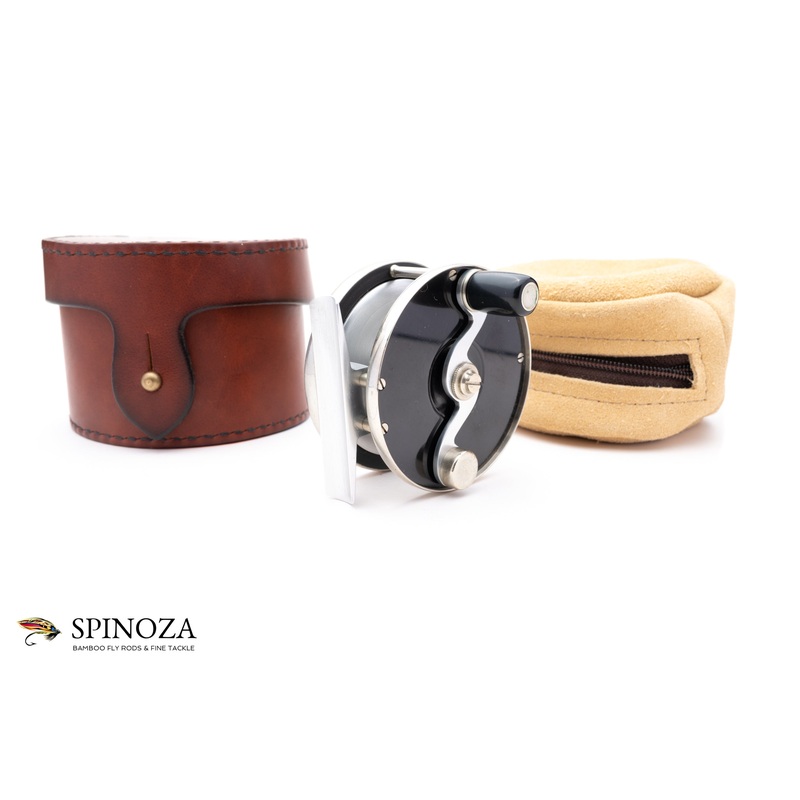A nice Ted Godfrey Paradigm fly reel, 2 3/4″ diameter and set up for LHW. It weighs 5.2 ounces on my scale, and I believe this is the “Malleo” model that Ted makes. There are a few tiny marks on the rims from handling as I don’t believe this reel has ever been fished. There are no mounting marks on the foot or any other normal signs of use. Classic S-handle design with a nickel silver frame and polished black sideplates. The reel sports an adjustable 10-position drag which is incredibly powerful (and unusual to find in a reel of this size). Aluminum foot. This would be a perfect reel to fish where light tackle is called for but you have the chance to run into some real bruisers. The reel packs into the original Arne Mason case with Ted’s stamp embossed on the top and also comes with a separate suede leather zipper pouch. A very nice little reel.