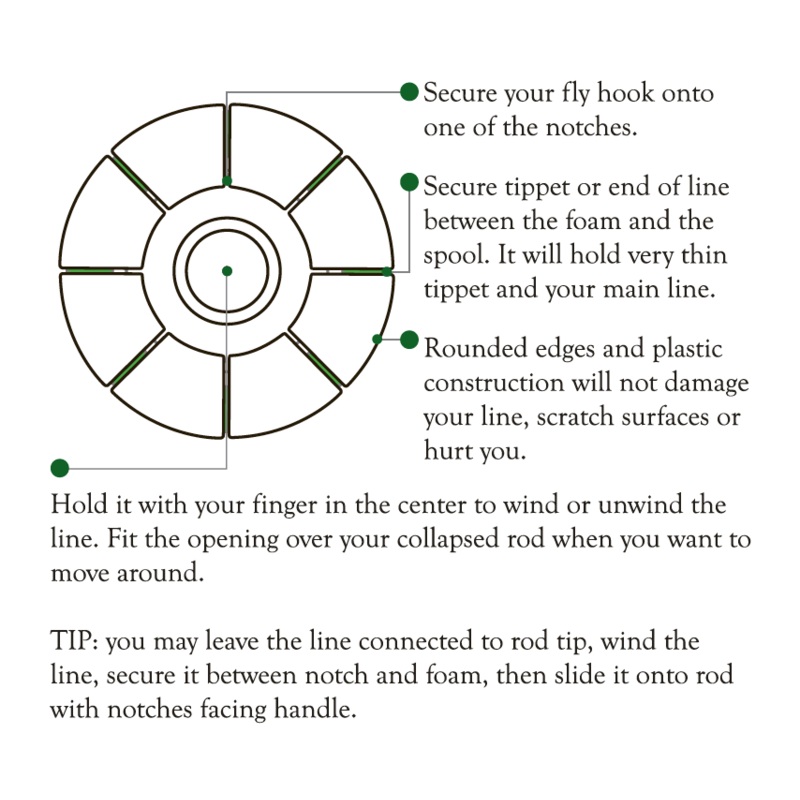 The tenkara line holder is a simple plastic spool with a core of yellow foam used to trap the line after you wind it. Made by Meiho, in Japan. It accommodates tenkara level lines and tenkara tapered lines, and it can be slid onto the handle for transport.