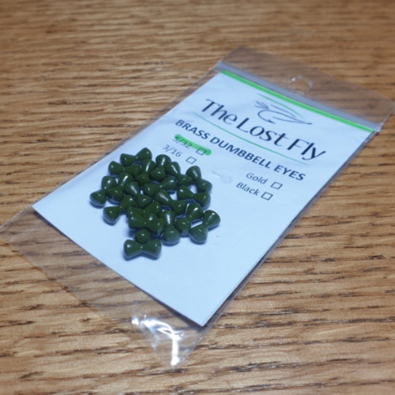 The Lost Fly Brass Dumbbell Eyes are currently only available in 5/32 for the olive. These offer greater durability, greater sparkle, and lead-free alternative to our lead dumbbells, at a slight price increase. Not quite as heavy as lead, these babies wont ever chip.