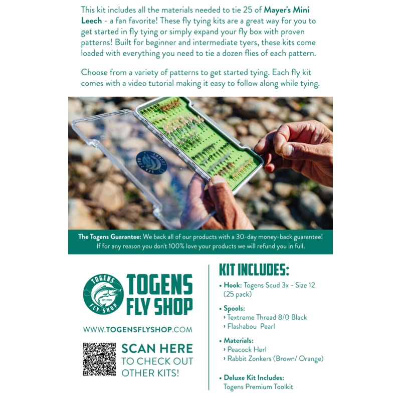 This kit includes all the materials needed to tie 25 of Mayer’s Mini Leech – a fan favorite! These fly tying kits are a great way for you to get started in fly tying or simply expand your fly box with proven patterns! Built for beginner and intermediate tyers, these kits come loaded with everything you need to tie a dozen flies of each pattern.