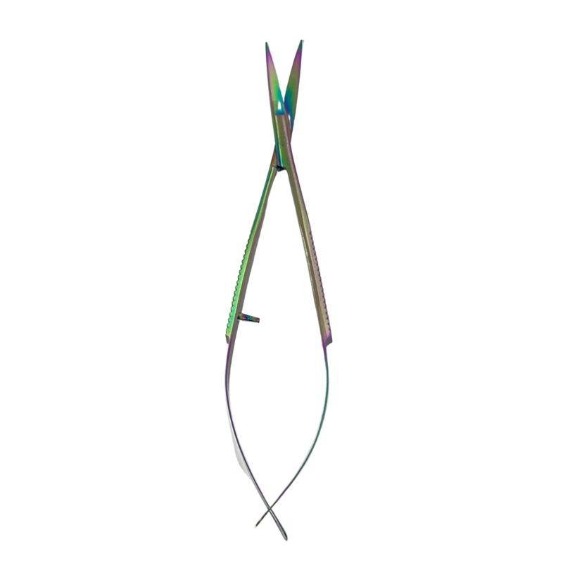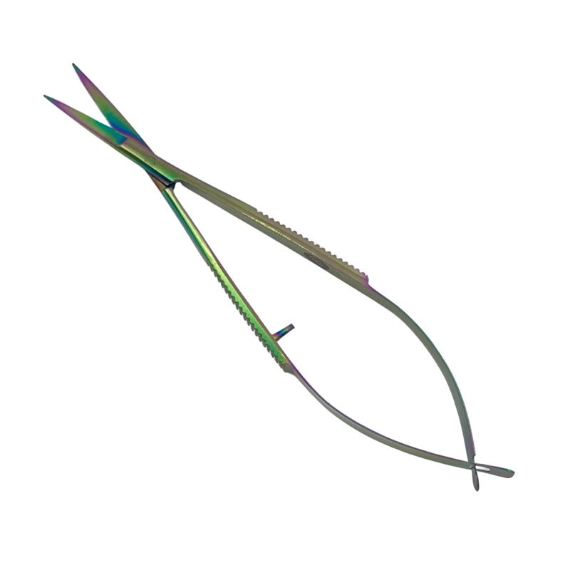 The ultimate one-handed scissor! No loops, just squeeze the spring arms and get a super close precision cut! These are titanium coated to give it that unique multi colored look to stand out on any fly desk!