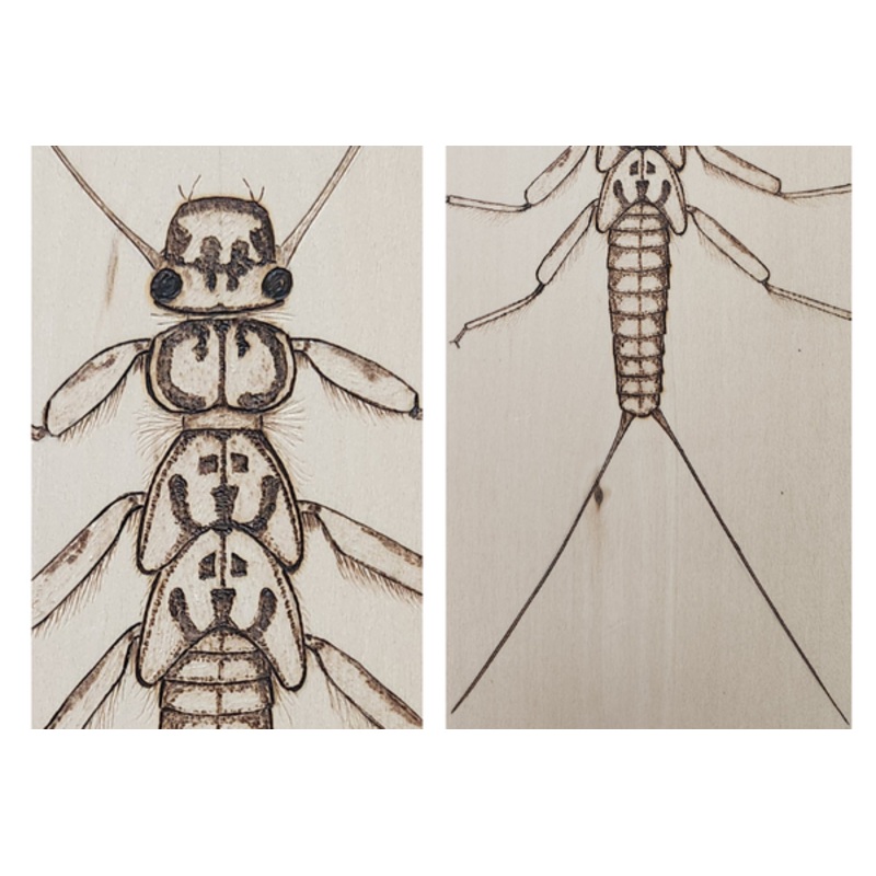 Trout Candy Stonefly nymph burned on basswood. Size 13″10″