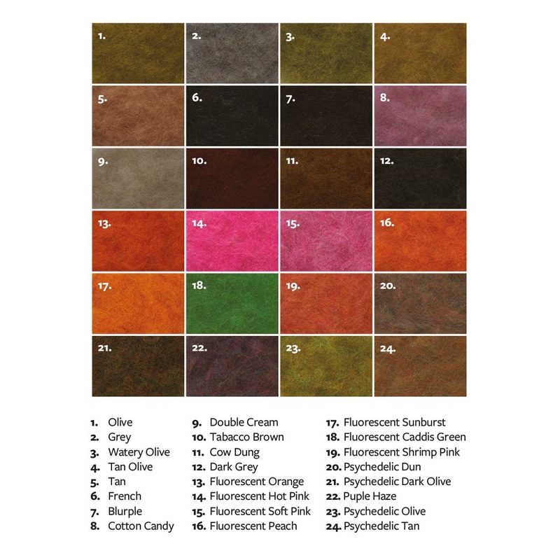 HARE’E ICE DUB|OLIVE|CADDIS GREEN|HARDERS BLOODY BLACK|PEACOCK|GREY|RUSTY ORANGE|GOLDEN BROWN|TAN|HARES EAR|BLACK|BROWN|WHITE|RUST|OLIVE BROWN