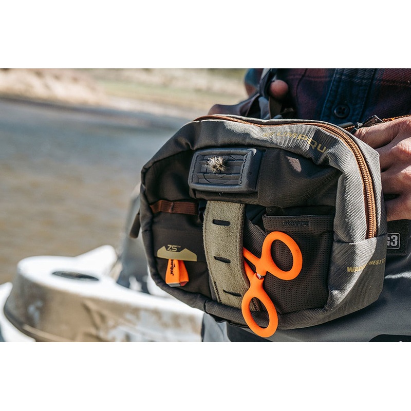 Once you clip this to your wader harness, you will have everything you need at your fingertips. This little chest pack handles two standard fly boxes along with all of the standard ZeroSweep features. One ZeroSweepTM retractor station (great for nipper and floatant attachment), ambidextrous hemostat station, foam fly patch and tippet holder cover all your key accessories. ZS2 version now includes a molle modular attachment station allowing integration with ZS2 accessories.