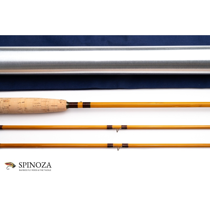 A nice Uslan bamboo fly rod, 8′, 2-piece, 2-tip, and built for a #6 line. Pentagonal design. This rod was restored by Sam Carlson in 1997. Fast DF action. Blonde cane with brown main wraps and bronze snake guides. The Super Z style ferrules are oxidized. The 6 1/4″ long medium cigar grip is clean as a whistle, having been replaced by Sam. The reel seat is a down-lock aluminum FE Thomas screwlock with a nickel silver pocket cap. The spacer is Pakka wood (artificial). As with all Sams work, the varnish is exceptional. The rod comes in a blue cloth bag and a brushed aluminum tube.