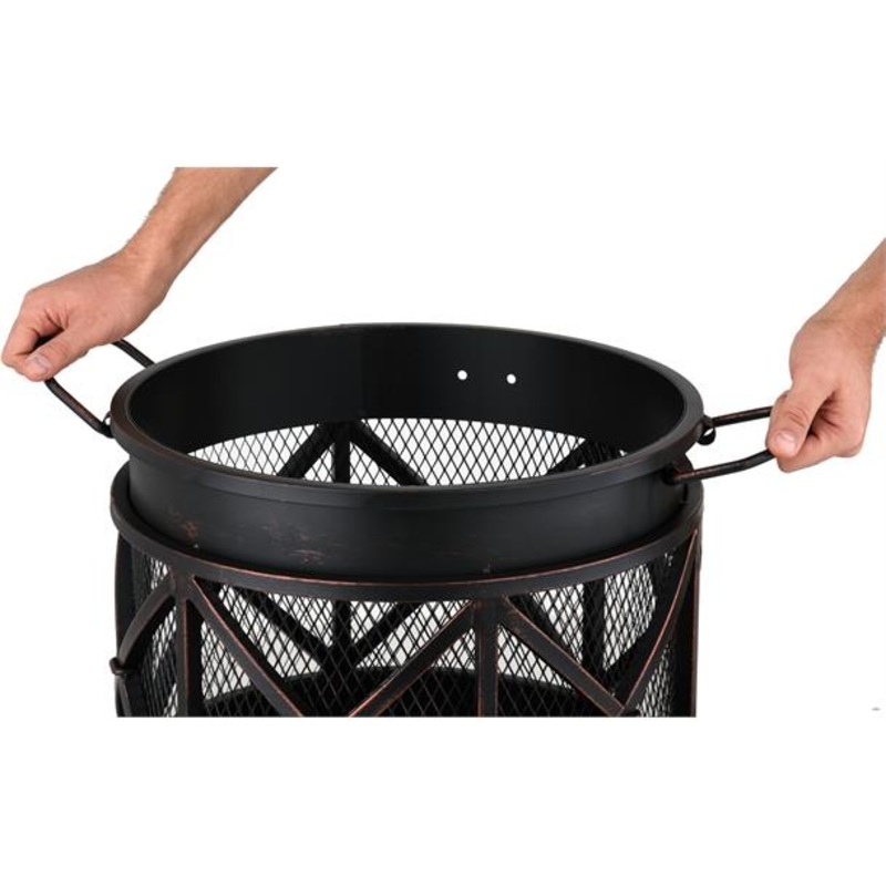 Denne blgropen i har et rustikt utseende vil vre et dekorativt og stemningsfullt tillegg til hagen din, samtidig som den holder deg varm nr det blir kaldere om kvelden. Denne solide branngropen med varmebestandig maling er laget av stl og er utmerket til absorbere og utstrle varme. Denne peisen har en stor og dyp bolle, og lar deg og familien din nyte en stor ild i timevis. Nettingen lar deg se den brennende ilden, og omslutter brannen for sikkerhet samt hindrer gnister og rusk i fly ut. I tillegg har hver side en praktisk ring slik at du enkelt kan bre den.